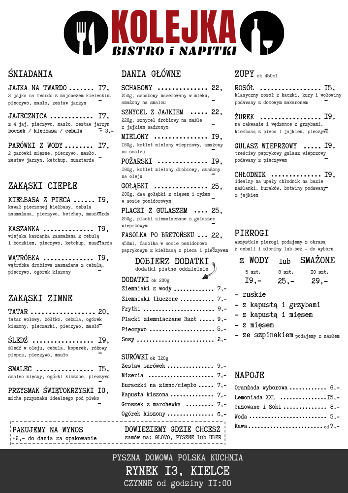 Kolejka to niewielkie bistro usytuowane w samym sercu Kielc na Rynku 13. Specjalizujemy się w polskiej domowej kuchni, przygotowywanej według receptur naszych mam i babć. Gotujemy tylko, ze świeżych składników od sprawdzonych dostawców. Nie używamy proszków, past czy innych polepszaczy smaku. Nasza kuchnia jest prosta, treściwa i taka jak w domu. Gotujemy codziennie od godziny 11 do późnych godzin nocnych. Możecie nas zjeść na miejscu w lokalu jak też w domu, pracy czy szkole - dzięki naszym dostawom realizowanym przez uber, pyszne.pl czy glovo. Chętnie podejmujemy się również cateringu poza naszym lokalem oferując szeroki zakres usług od dostarczania obiadów pracowniczych, przygotowywania dań bankietowych na produkcji własnych wyrobów garmażeryjnych kończąc.
